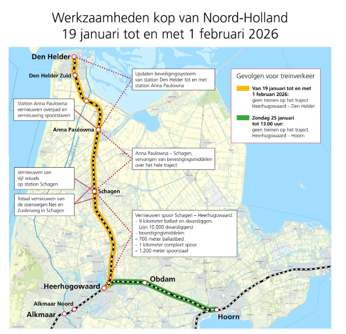 Van 19 januari tot en met 1 februari rijdt NS bussen in plaats van treinen op het traject Heerhugowaard-Den Helder. De precieze dienstregeling van de bussen is eind december in de reisplanners te vinden.